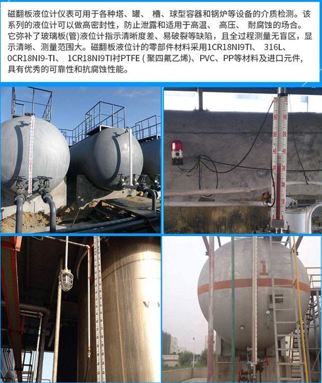 磁翻板液位計(jì)廣泛用于石油、化工、油田、醫(yī)藥、食品、酒業(yè)等行業(yè)中各類(lèi)貯液罐、貯槽、貯液池、反應(yīng)罐、發(fā)酵罐內(nèi)液體、油田、液化氣、液氫、強(qiáng)酸堿液、弱酸堿液、發(fā)電廠鍋爐汽包、高低加、回水箱高低壓加熱器、凝結(jié)器、蒸發(fā)患有主其他壓力容器內(nèi)與1Cr8NitTi、304+PTEE(聚四氟乙烯)、316L、PVC、PP相容液體介質(zhì)的液位、液面及兩種不同介質(zhì)界面測(cè)量與顯示。