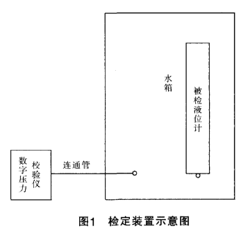 該檢定裝置如圖1所示,包括數(shù)字壓力校驗(yàn)儀、水箱、連通管、水箱、各種液位計(jì)接口和固定裝置。