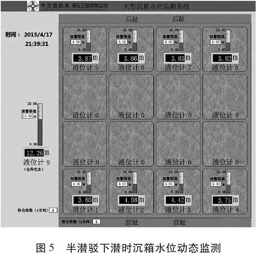 漳州后石港區(qū)3 號泊位碼頭工程采用重力式沉箱結(jié)構(gòu),該工程沉箱共15 件,單件質(zhì)量4 365 t,沉箱長、寬、高分別為19. 8、21. 9 、25. 0 m; 沉箱分7 層澆筑,澆筑*頂層時(shí)3# 格倉按設(shè)計(jì)圖紙預(yù)留3 m 高的缺口。在漳州預(yù)制廠預(yù)制,沉箱安裝施工現(xiàn)場距離預(yù)制廠約6. 3 km。沉箱采用氣囊橫移至出運(yùn)通道,再縱移至出運(yùn)碼頭前沿線上駁,采用8 000 t 半潛駁下潛安裝。根據(jù)浮游穩(wěn)定計(jì)算,沉箱各格倉壓載水見圖4。2#、6# 格倉為3. 98 m,3#、7#格倉為4. 34 m,其余格倉為3. 80 m,沉箱倉外吃水12. 15 m。根據(jù)當(dāng)?shù)厮恼境毕恚?015-04-17T20∶30 下潛坑潮位條件符合下潛要求,半潛駁在下潛區(qū)開始加水下潛; 下潛至沉箱吃水1. 8 m 時(shí),同時(shí)開啟沉箱的8 個(gè)注水閥門開始向沉箱格倉中注入壓載水; 當(dāng)沉箱吃水5 m 時(shí)半潛駁暫停下潛,起重船靠近半潛駁,工人將連接起重船吊鉤的鋼絲繩用卡環(huán)固定在沉箱頂部吊環(huán)上。半潛駁繼續(xù)下潛至9 m 時(shí)再暫停下潛,等待吊纜就位。半潛駁繼續(xù)下潛,在沉箱底與枕木支墊處于脫離的臨界狀態(tài)時(shí),減緩半潛駁下潛速度,直至沉箱完全脫離浮船塢。此時(shí)啟動(dòng)吊機(jī),使鋼絲繩處于輕微受力狀態(tài)。在半潛駁下潛及沉箱格倉注入壓載水過程中,通過大型沉箱水位監(jiān)測系統(tǒng)能夠動(dòng)態(tài)顯示各格倉水位值及沉箱的吃水深度( 圖5)
