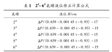 因液氨密度受溫度影響大,且每個氨罐的保溫效果也有差異,故如需準(zhǔn)確測量氨罐液位,必須引入溫度測量。對2#~6#氨罐分別進行卸壓,并引入熱電偶遠傳至DCS系統(tǒng),對密度進行修正,修正公式為Q液=0.639-0.00145t。經(jīng)過以上修正,2#~6#氨罐液位修正計算公式如表1所示。
