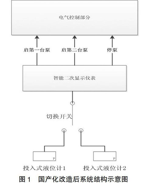 如圖1所示,國(guó)產(chǎn)化改造后,地面排水控制系統(tǒng)用防凍液液位計(jì)測(cè)量地坑液位,用智能二次儀表接收防凍液液位計(jì)的信號(hào),并根據(jù)設(shè)定的液位報(bào)警值向電氣控制部分發(fā)出啟動(dòng)和停運(yùn)排水泵信號(hào),控制系統(tǒng)配置了2個(gè)防凍液液位計(jì),通過(guò)1個(gè)轉(zhuǎn)換開(kāi)關(guān),可以選擇投入使用的液位計(jì),也可對(duì)比兩個(gè)液位計(jì)的測(cè)量數(shù)據(jù),通過(guò)定期巡檢發(fā)現(xiàn)液位測(cè)量故障。