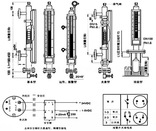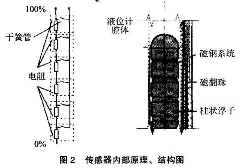 傳感器的作用是采樣液位高低位置并轉(zhuǎn)換成標(biāo)準(zhǔn)信號(hào)傳送至控制室,傳感器實(shí)際由干簧管和電阻組成。當(dāng)浮子內(nèi)磁鋼位置變化后,磁場(chǎng)通過器壁帶動(dòng)傳感器內(nèi)干簧管觸點(diǎn)吸合。干簧管吸合的位置決定回路的阻抗大小,干簧管的通常位置為10mm1組?;芈返拇笮≌门c液位的高低成正比,這樣*后由置于傳感器外殼內(nèi)的變送器將電阻信號(hào)轉(zhuǎn)換成標(biāo)準(zhǔn)的電流信號(hào),送至控制室。具體結(jié)構(gòu)、原理圖見圖2。