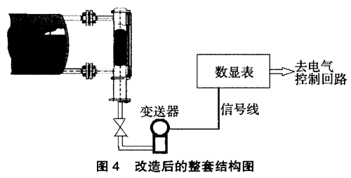 在外配1塊可輸出開關(guān)量接點(diǎn)的模擬量顯示儀表,這樣可實(shí)現(xiàn)液位的自動(dòng)控制,集體的偏差多少可以在就實(shí)際進(jìn)行整定試驗(yàn)。整套測(cè)量系統(tǒng)的結(jié)構(gòu)圖見圖4。