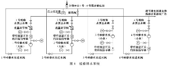每臺檢修水泵均配置逆止閥、壓力表和帶流量開關(guān)的示流信號器,在1號、2號水泵出水管處各安裝了一個流量調(diào)節(jié)閥。系統(tǒng)中共有2根總管,一根為水泵的總吸水管,包括從每臺機(jī)組尾水管底部至總管的支管,總吸水管和部分支管及管路上的操作閥門布置在廠房管路廊道中;另一根為總排水管,可將水排至滲漏集水井中,再經(jīng)滲漏排水泵排至下庫。
