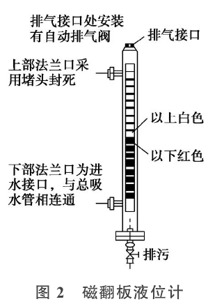 三、磁浮球液位計(jì)替換壓力變送器的技改針對壓力變送器測量尾水管水位時,測量值產(chǎn)生誤差的缺陷,對壓力變送器的動作條件以及現(xiàn)場的實(shí)際情況進(jìn)行了初步分析,認(rèn)為利用連通器的原理,在總吸水管上面安裝一套浮子式的水位開關(guān),這樣既能直觀地反映實(shí)時水位,又能保證水泵的安全、可靠運(yùn)行,浮子開關(guān)的位置可以根據(jù)實(shí)際的工作水位進(jìn)行布置,利用浮子的開關(guān)量去控制水泵的正常啟停。經(jīng)查找多方面的資料以及咨詢相關(guān)設(shè)備的廠家后,決定對檢修排水系統(tǒng)增加一套水位測量裝置,具體方案為:在水泵的總吸水管上面安裝一套磁浮球液位計(jì),如圖2所示。