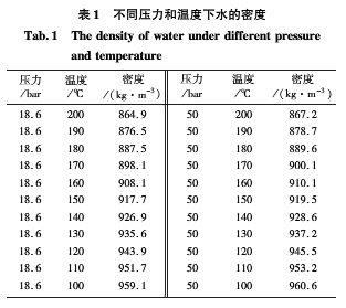 在實(shí)際過程中,加熱器中不同位置的水溫是不一致的,它和加熱器的形狀、體積等條件有關(guān),同理在測(cè)量通道中不同位置的水溫也是不一致的。這會(huì)對(duì)理論計(jì)算造成較大的困難,在此對(duì)容器中水的溫度分布做了簡(jiǎn)化。如圖1所示,在閥門V的左端為加熱器的水溫,假設(shè)水溫一致,且都為T1,在閥門V的右端為測(cè)量通道的水溫,設(shè)水溫一致,且都為T2。在加熱器額定工作壓力P的情形下,T1溫度和T2溫度下對(duì)應(yīng)的水的密度分別為ρ1和ρ2。在閥門V處,左端的壓力等于右端的壓力,由此可得:
