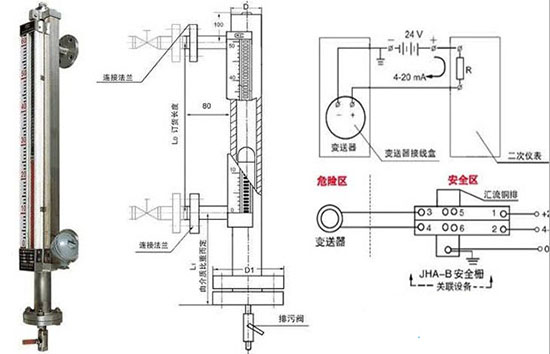 液體液位計是以浮子內(nèi)磁鋼驅動雙色薄片的翻轉來指示液位的一種新型儀表,主體不銹鋼內(nèi)腔管中磁浮子隨液位的升降而上下運動,同時驅使主體外指示器內(nèi)的雙色薄片翻轉,有液位時轉示紅色、無液位時顯示白色。液體液位計以紅色和白色色帶間的界線即代表液位高度。在指示器左側配有醒目的刻度標尺,從而使液位的指示顯得更加清晰。不僅可以實現(xiàn)現(xiàn)場就地觀測,也可以加裝遠傳裝置實現(xiàn)遠程監(jiān)控及報警等功能。