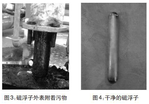 經(jīng)過(guò)兩年多運(yùn)行,污水罐內(nèi)可能沉淀污泥雜質(zhì)導(dǎo)致液位計(jì)示數(shù)不準(zhǔn)。現(xiàn)場(chǎng)拆卸液位計(jì),并且對(duì)浮球和磁浮子進(jìn)行清洗。(圖3-圖4)