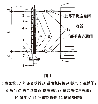 1測量筒;2外部顯示器;3磁性色標板;4標尺;5磁浮子;6法蘭:7法蘭堵盞;8排液閥門;9磁式液位開關組;10緊固夾;11平衡連通管;12磁濾清裝置元件上磁性材料的作用而發(fā)生翻轉。翻板或翻柱上涂有兩種視覺區(qū)分較大的顏色,觀看液位顯示器中翻板或翻柱的顏色分界線就可知容器中液位的情況。測量筒垂直方向的上下兩端安裝有閥門,其中上閥門用于平衡氣壓,下閥門用于放走殘留液體。