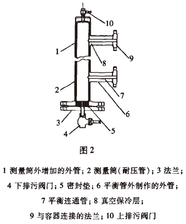 在原有的液位計結構基礎上,在測量筒外增加一真空保溫層。由于測量筒中的液體跟容器中的液體是相同的,故測量筒外的真空保溫層阻隔了測量筒內(nèi)的低溫液體與外界空氣的溫度影響。實踐證明。此項改進確實起到了良好的隔溫作用。但此結構在實際裝置運行中,平衡連通管周圍會凝結出大量冰塊。通過分析,由于測量筒與容器間是通過上下兩根平衡管相連接的,在液位計可正常指示時,下平衡管中始終充滿低溫液體。因在測量筒外增加的真空保溫層不能阻隔平衡管與外界的直接接觸,故在平衡管四周還是會出現(xiàn)大量的冰塊。