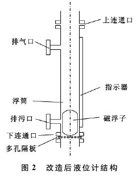 (3)方案3。改造現(xiàn)有的液位計,采用上下端日連接,上過程進日改為排氣口,下過程進日改為排污口,原安裝浮子法鑄和排氣閥接日改為連通日,在下部增加一個多孔隔板,保證浮子不進人工藝管線,同時保證液體的正常流動。在保證不改變液位計結(jié)構情況下,將液位計與工藝管線連接。此方案優(yōu)點是花費少,不閑置設備,并且還能達到液位計與管線清理同步,實現(xiàn)維修與檢修同步。