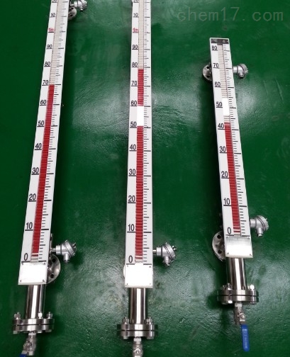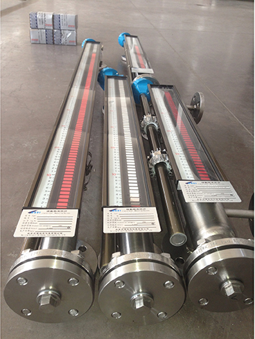 根據(jù)浮力原理,浮子在測(cè)量管內(nèi)隨液位的升降而上、下移動(dòng),浮子內(nèi)的永久磁鋼通過耦合作用,驅(qū)動(dòng)紅、白色翻柱翻轉(zhuǎn)180°,液位上升時(shí)翻柱由白色轉(zhuǎn)為紅色,下降時(shí)由紅色轉(zhuǎn)為白色,從而實(shí)現(xiàn)液位指示。