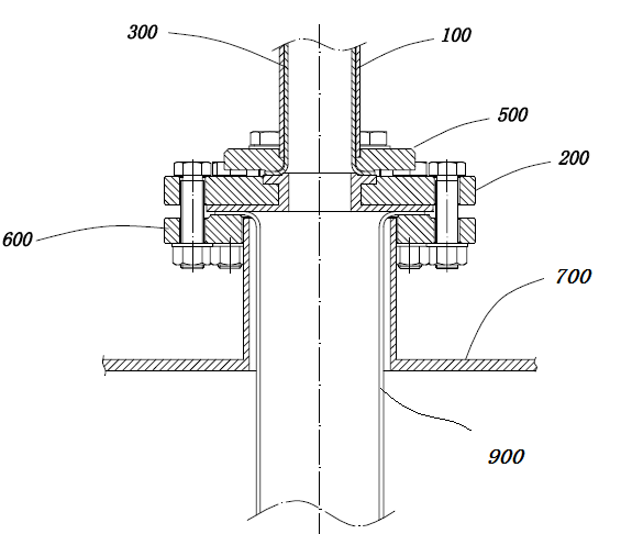 針對傳統(tǒng)頂裝式污水液位計的這些弊端,在多次試驗的基礎(chǔ)上,對現(xiàn)有的內(nèi)襯工藝與結(jié)構(gòu)做了改進,發(fā)明了頂裝式污水液位計的一種新工藝及其結(jié)構(gòu),如下圖所示,其提供了*一連接件和連接內(nèi)襯。該連接內(nèi)襯具有用于連通內(nèi)襯連接口的*一連接口、自*一連接口向外成環(huán)形設(shè)置的*一密封部、用于與被測容器連通的*二連接口和自*二連接口向外成環(huán)形設(shè)置的*二密封部。由于該*一連接件和連接內(nèi)襯為單獨設(shè)置,可以單獨制造,因此*一密封部和*二密封部可以制作的足夠大,從而實現(xiàn)*一密封部與浮筒內(nèi)襯的翻折部密封抵接;同時,連接內(nèi)襯的*二密封部用于與容器實現(xiàn)密封連接。由此,該連接內(nèi)襯可以與浮筒內(nèi)襯和容器開口內(nèi)的護筒形成完全密封的連接,從而避免連接處的金屬面受腐蝕,使生產(chǎn)安全順利地進行,免受因發(fā)生生產(chǎn)安全事故對生命和財產(chǎn)造成的安全威脅。