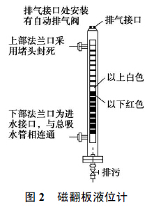 它結(jié)構(gòu)是利用旁通管的原理, 主導(dǎo)管內(nèi)的液位和尾水管內(nèi)的液位高度一致, 根據(jù)阿基米德定理, 磁性浮子在液體中產(chǎn)生的浮力和重力平衡, 當(dāng)尾水管中的水位升降時(shí), 液位計(jì)主導(dǎo)管內(nèi)的浮子也隨之升降, 浮子內(nèi)的永久磁鐵通過磁耦合驅(qū)動指示器內(nèi)的翻板指示器, 當(dāng)液位上升或下降時(shí), 翻板指示器由白色翻轉(zhuǎn)為紅色, 或由原來的紅色翻轉(zhuǎn)為白色, 指示器的顏色改變的高度就是被測水位的實(shí)際高度, 從而實(shí)現(xiàn)液位的現(xiàn)場指示, 以供運(yùn)行人員目測尾水管的實(shí)時(shí)水位。安裝于液位計(jì)管壁外側(cè)的磁記憶開關(guān),可多點(diǎn)設(shè)置、滑動調(diào)整位置, 提供了液位開關(guān)量報(bào)警功能。在裝置的頂部安裝了一個(gè)自動排氣裝置, 當(dāng)主導(dǎo)管內(nèi)液位上升時(shí)能夠自動的排氣, 下降時(shí)能夠按時(shí)補(bǔ)氣。