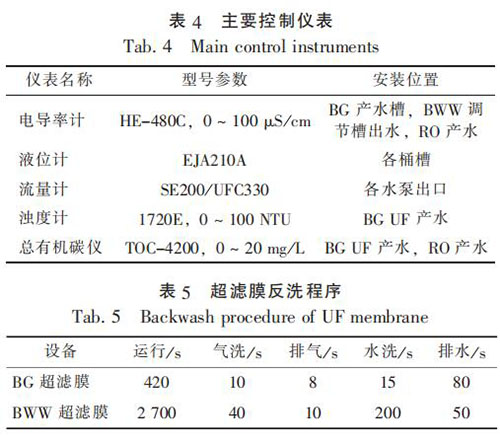 膜處理工藝應(yīng)用中, 通量下降過(guò)快是影響系統(tǒng)正常運(yùn)行的主要因素。 而人工清洗需要耗費(fèi)大量人力, 為此通過(guò)程序設(shè)定實(shí)現(xiàn)自動(dòng)反洗。BG 和 BWW 超濾膜采用先氣洗后水洗的清洗模式, 程序設(shè)定見(jiàn)表 5。