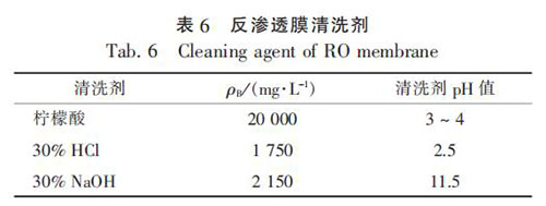 反滲透膜運行一定時間后, 污染物會在膜表面沉積, 需要定期進行化學(xué)清洗以完全恢復(fù)膜性能。 本系統(tǒng)設(shè)計清洗周期為 3 個月, 清洗包括循環(huán)、 浸泡、 沖洗 3 個過程, 將清洗劑引入反滲透膜 組 , 按 每 支 膜 11.4 L / min 的 流 量 循 環(huán) 5 ~ 15min, 再將單支膜流量調(diào)至 22.8 L / min 循環(huán) 5 ~ 15min, 然后再將單支膜流量調(diào)至 35 L / min 循環(huán) 30 ~60 min, 隨后進入浸泡階段, 1 ~ 2 h 后進行沖洗,直至濃水電導(dǎo)率與進水電導(dǎo)率相同。 反滲透膜采用先酸洗后堿洗的步驟進行, 酸洗和堿洗均經(jīng)過上述過程, 酸洗劑可選用檸檬酸或 HCl, 堿洗劑選用 NaOH。 清洗劑選擇見表 6。
