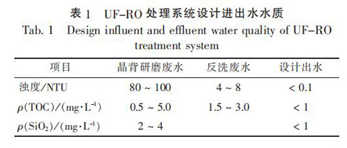 國內(nèi)某鹽酸罐液位計廠, 晶背研磨廢水產(chǎn)生量為 150 ~160 m3 / d, 反洗廢水產(chǎn)生量 為 500 ~ 700 m3 / d, 主要污染物為懸浮物, UF-RO 處理系統(tǒng)設(shè)計進水和出水主要水質(zhì)指標(biāo)見表 1。