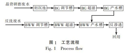 晶背研磨廢水在排放機臺附近設(shè)置簡易平流式沉淀池, 經(jīng)初沉后進入調(diào)節(jié)槽, 經(jīng)過保安過濾器過濾后, 再進超濾膜組, 產(chǎn)水流入產(chǎn)水槽; 反洗廢水進入調(diào)節(jié)槽, 經(jīng)過保安過濾器過濾后, 再進超濾膜組, 產(chǎn)水流入產(chǎn)水槽。 兩種超濾產(chǎn)水混合后, 經(jīng)保安過濾器, 進入反滲透膜組, 產(chǎn)水回用至超純水預(yù)處理系統(tǒng), 濃水排放至廢水系統(tǒng)。