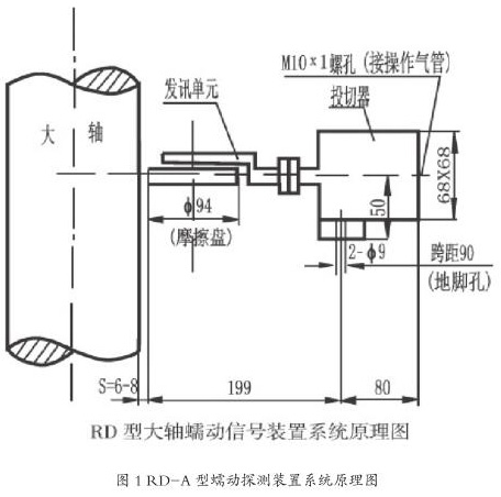 該電站蠕動(dòng)探測(cè)之前主要使用的是氣動(dòng)式機(jī)械蠕動(dòng)裝置和電動(dòng)式機(jī)械蠕動(dòng)裝置,哈電機(jī)組和 VHS 機(jī)組使用的是氣動(dòng)式蠕動(dòng)裝置,型號(hào)為 RD-A 哈控,RD-A 型蠕動(dòng)探測(cè)裝置由投切器和發(fā)訊單元兩部分組成,當(dāng)機(jī)組停機(jī)完成后通過蠕動(dòng)控制電磁閥(空氣電磁閥)向投切器通入壓縮空氣,它將發(fā)訊單元向前推進(jìn),使其磨擦盤與機(jī)組大軸表面相接觸(有稍許正壓力)。如果大軸發(fā)生蠕動(dòng),轉(zhuǎn)角達(dá)到 1.5° ~2°時(shí),發(fā)訊單元便發(fā)出大軸蠕動(dòng)信號(hào),作用于報(bào)警與制動(dòng)回路,投入制動(dòng)閘以防蠕動(dòng)現(xiàn)象擴(kuò)延。機(jī)組起動(dòng)前,先動(dòng)作空氣電磁閥使投切器排氣,由于彈簧力的作用,發(fā)訊單元退回原位。離開大軸表面 6 mm~8 mm,確保裝置安全。RD-A型蠕動(dòng)探測(cè)裝置系統(tǒng)原理如圖1所示。RD-A型探測(cè)裝置易卡澀導(dǎo)致探測(cè)裝置投退失敗,影響開停機(jī)成功率。東電機(jī)組使用的是電動(dòng)式蠕動(dòng)裝置,型號(hào)為 PXJ-1D。PXJ-1D 型蠕動(dòng)探測(cè)裝置多起反饋信號(hào)拒動(dòng)的事件,導(dǎo)致開停機(jī)流程退出,其原因?yàn)殡妱?dòng)式蠕動(dòng)裝置控制回路與位置反饋節(jié)點(diǎn)取自同一個(gè)行程開關(guān),當(dāng)行程開關(guān)常閉節(jié)點(diǎn)斷開時(shí),電機(jī)停止轉(zhuǎn)動(dòng),而此時(shí)可能因行程過短導(dǎo)致常開節(jié)點(diǎn)尚未閉合,位置信號(hào)無(wú)法正常上送至監(jiān)控系統(tǒng)。為了解決這一問題,目前電站 15 臺(tái)機(jī)組蠕動(dòng)探測(cè)裝置已換型為非接觸式蠕動(dòng)探測(cè)裝置,避免開停機(jī)過程中投入或退出蠕動(dòng)失敗導(dǎo)致的流程退出。非接觸式蠕動(dòng)探測(cè)裝置設(shè)計(jì)原理為 :