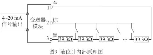為尋求更好的改進方案,對氨水液位計的測量原理進行了深入研究。液位計測量桿中是由等間距排布的干簧管和電阻元件組成,當磁浮子達到某一高度時,對應的干簧管閉合,如果能識別出哪個干簧管閉合,即可獲得當前液位值。那么變送器又是如何識別出哪個干簧管閉合的呢?再次探究測量桿內(nèi)部電路,繪制液位計內(nèi)部原理圖,如圖3所示。測量桿內(nèi)部電阻串聯(lián)連接,每兩個電阻的連接處連接干簧管的一端,干簧管的另一端并聯(lián)連接,*終引出蘭、棕、黑三根信號線。