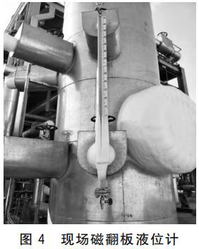 現(xiàn)場(chǎng)磁翻板液位計(jì)(圖4)由于儲(chǔ)罐壓力偏高,正常生產(chǎn)時(shí)為3MPa,導(dǎo)致磁翻版液位計(jì)浮子被壓扁。解決方法:尋找能夠生產(chǎn)耐高壓低密度液位計(jì)浮子廠家。