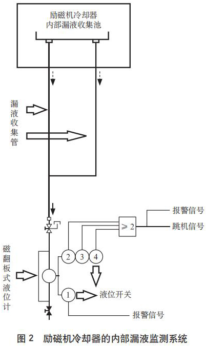 實(shí)際運(yùn)行經(jīng)驗(yàn)表明,球罐液位計(jì)內(nèi)部銅管發(fā)生泄漏的概率較低,但一旦發(fā)生泄漏,漏液會隨著冷卻空氣沿閉合風(fēng)路進(jìn)入勵磁機(jī)內(nèi)部,造成勵磁機(jī)短路損壞的嚴(yán)重后果。為了保證機(jī)組安全,應(yīng)有冷卻器內(nèi)部銅管泄漏監(jiān)測裝置,然而現(xiàn)場沒有配置此類裝置。