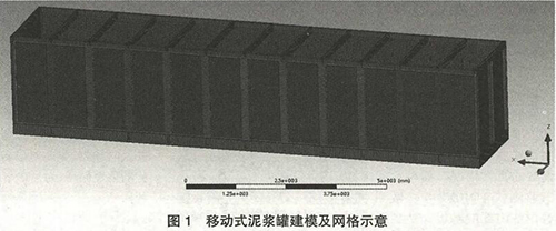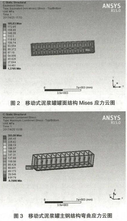 (2)考慮在使用過程中,可能出現(xiàn)兩個滿載的相同泥漿罐疊放的*端工況,因此底部泥漿罐在滿載的情況下還要承受上部相同尺寸的滿載泥漿罐的自重。將上部滿載泥漿罐的自重等效為加載在下部泥漿罐頂結構的均布壓力其中,見為滿載泥漿槽自重,識=168782x9.81=1655752為儲存罐頂部方管的長度乂=29.丨8111。因此/^56.8犯11?。