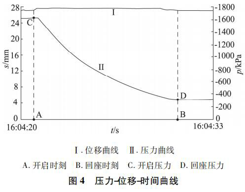 運用安全閥冷態(tài)試驗裝置對該苯酚液位計進行動作性能試驗,將試驗容器內(nèi)的介質(zhì)壓力卸放到整定壓力以下,開啟試驗容器和安全閥進口端的球閥,關(guān)閉流量計管路閥門,開啟主測試管路截止閥,開啟儲氣容器通向試驗容器的節(jié)流閥,逐漸加壓,同時啟動計算機數(shù)據(jù)采集系統(tǒng),被試安全閥開啟,繼續(xù)升高壓力,直至被試安全閥保持全開啟( 排放) 狀態(tài),然后關(guān)閉儲氣容器通向試驗容器的閥門,被試安全閥亦逐漸關(guān)閉。計算機自動生成試驗過程的壓力、位移曲線,試驗人員記錄采集開啟壓力、排放壓力、回座壓力、開啟高度等數(shù)據(jù)。重復上述試驗至少 3 次,得到相應壓力-位移-時間曲線,見圖 4。左縱坐標為位置,右縱坐標為壓力,其中上部曲線代表導閥位移,下部曲線代表壓力變化。當導閥位置發(fā)生變化,代表導閥開始開啟動作,此時的壓力為該苯酚液位計的開啟壓力,即整定壓力; 當導閥位置回到原點代表導閥已經(jīng)回座,此時對應的壓力即為回座壓力。