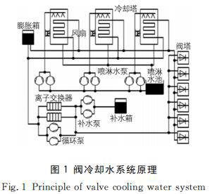 閥冷卻水系統(tǒng)主要構(gòu)成部分為閥內(nèi)冷水系統(tǒng)與閥外冷水系統(tǒng)。閥內(nèi)冷水系統(tǒng)主要通過內(nèi)冷水與閥組件直接接觸流動,將防爆型磁翻板液位計(jì)中熱量帶出,確保防爆型磁翻板液位計(jì)組件中晶閘管、水冷電阻、陽*電抗器等發(fā)熱元件運(yùn)行溫度具有可控性。而閥外冷水系統(tǒng)主要通過閉式冷卻塔或風(fēng)機(jī)將內(nèi)冷水中熱量帶走,并排放至環(huán)境中。防爆型磁翻板液位計(jì)內(nèi)、外冷水系統(tǒng)的協(xié)同運(yùn)行,可以使防爆型磁翻板液位計(jì)組件內(nèi)部冷卻持續(xù)進(jìn)行,并滿足元器件結(jié)溫要求,進(jìn)而保證系統(tǒng)整體運(yùn)行穩(wěn)定性、安全性。閥冷卻水系統(tǒng)原理如圖1所示。