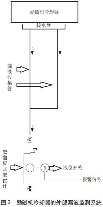 實(shí)際運(yùn)行經(jīng)驗(yàn)表明,側(cè)裝式磁翻板液位計(jì)內(nèi)部銅管發(fā)生泄漏的概率較低,但一旦發(fā)生泄漏,漏液會(huì)隨著冷卻空氣沿閉合風(fēng)路進(jìn)入勵(lì)磁機(jī)內(nèi)部,造成勵(lì)磁機(jī)短路損壞的嚴(yán)重后果。為了保證機(jī)組安全,應(yīng)有冷卻器內(nèi)部銅管泄漏監(jiān)測(cè)裝置,然而現(xiàn)場(chǎng)沒(méi)有配置此類裝置。