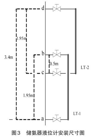 如圖3將LT-1液位計(jì)的總高度1.95m,占儲(chǔ)氨罐 a 點(diǎn)到 d 點(diǎn) 3.4m 的 57%;而 LT-2 液位計(jì)的總高度1.95m,占儲(chǔ)氨罐a到d點(diǎn)3.4m的57%;所以要將軟件數(shù)據(jù)庫(kù)內(nèi)的量程值對(duì)應(yīng)修改為:LT1量程下限:0%、量程上限 57%;LT2 量程下限:0%、量程上限57%。