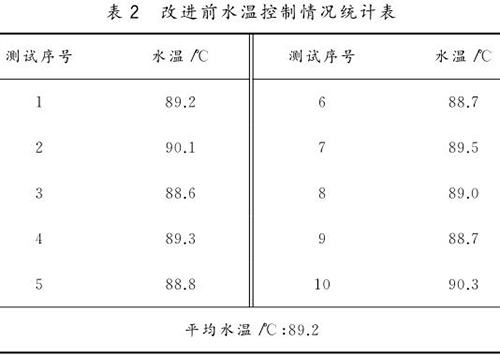 根據(jù)生產(chǎn)標(biāo)準(zhǔn)設(shè)定水溫為85℃,進(jìn)行了10次測(cè)試,平均水溫為89.2℃(見表2),超出了設(shè)定溫度4.2℃。