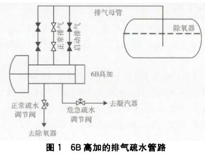 6B高壓加熱器設(shè)有2路啟動(dòng)排氣和1路正常排氣,3路排氣管道匯至1根管道進(jìn)人除氧器并插人除氧器正常液面以下,如圖1所示。啟動(dòng)階段高壓加熱器啟動(dòng)排氣閥門和正常排氣閥門均開啟排氣,正常運(yùn)行時(shí)啟動(dòng)排氣閥關(guān)閉,正常排氣閥開啟。排氣管線從7.5 m平臺(tái)經(jīng)過(guò)多次折向匯集到23 m排氣母管,然后再引人除氧器,這導(dǎo)致排氣管線存有蒸汽冷凝水;由于在排氣管線上存有一定的冷凝水,啟動(dòng)排氣閥開啟后,存在于排氣管道的冷凝水依靠重力排至高壓加熱器汽側(cè),在啟動(dòng)排氣管至除氧器的管路中形成一定的真空,從而產(chǎn)生虹吸作用,使除氧器的水吸人6B高壓加熱器,導(dǎo)致B側(cè)高壓加熱器液位異常升高而發(fā)生解列。