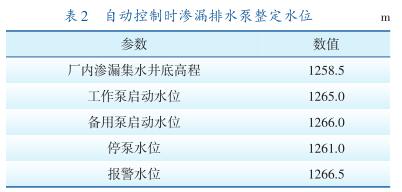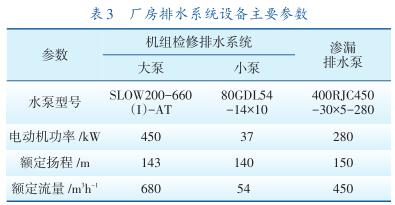 呼蓄電站廠房排水系統(tǒng)包括地下廠房滲漏排水系統(tǒng)、機組檢修排水系統(tǒng)。地下廠房滲漏排水系統(tǒng)設有1個滲漏集水井,有效容積364 m 3 ,設5臺滲漏排水泵,3運2備,系統(tǒng)*大滲漏總排水量為2250m 3 /h。滲漏排水泵正常運行時由廠內(nèi)滲漏排水控制盤PLC或監(jiān)控系統(tǒng)自動控制啟停,也可就地通過每臺泵的啟動柜手動啟停。自動控制時整定水位見表2。廠房排水系統(tǒng)設備主要參數(shù)見表3。