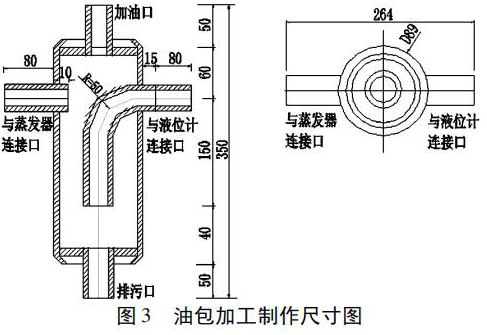 1. 現(xiàn)場(chǎng)加工制作油包。油包式液位計(jì)包括油包和防霜磁翻板液位計(jì)兩部分,通 過 管 道、閥 門 連 接 而成。油包是油包式液位計(jì)的關(guān)鍵部件,容積過小或與防霜磁翻板液位計(jì)連接不符合要求,有可能造成液位上升、下降緩慢,液位反應(yīng)不靈敏,或者油包結(jié)霜。圖 3 為油包加工制作尺寸圖,現(xiàn)場(chǎng)加工按圖紙要求制作。