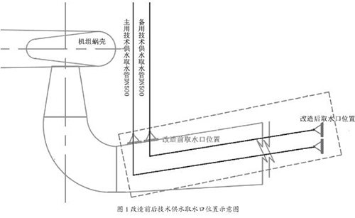 (3)對(duì)下游電站技術(shù)供水取水口進(jìn)行調(diào)整,將技術(shù)供水取水管向尾水管擴(kuò)散段側(cè)面下游方向延伸 33 m,將取水口升高 3 m,并在取水口加裝過濾網(wǎng),以過濾較大的砂石、木塊等,減少對(duì)磁翻板液位計(jì)、濾水器等的沖擊磨損和堵塞。改造前后的技術(shù)供水取水口示意圖如圖 1 所示。