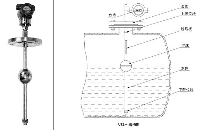 鍋爐浮球液位計(jì)由浮球、插桿等組成。浮球液位計(jì)通過連接法蘭安裝于容器頂上
