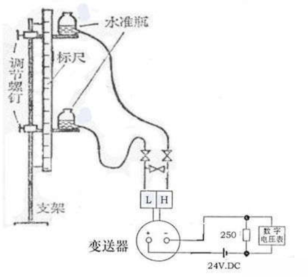 當(dāng)液體密度恒定時(shí),測(cè)出差壓就就可知道液位高度,而與液體容積無(wú)關(guān),或者說(shuō)知道了液體高度,也就知道了差壓,即△P=ρH。模擬校驗(yàn)法就是基于上述原理進(jìn)行的?,F(xiàn)以校驗(yàn)水位計(jì)為例,介紹一下具體方法,校驗(yàn)裝置及接線(xiàn)如圖所示: