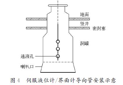 儀表安裝應(yīng)便于儀表維護、更換及觀測,儀表的觀測面應(yīng)朝向操作通道,周圍不應(yīng)有妨礙維修儀表的物件,因而洞罐液位計、界面計和多點平均溫度計的變送單元均安裝在豎井口??紤]到洞罐埋設(shè)深度及洞罐儀表檢測元件的長度,為便于儀表安裝,保護洞罐儀表的檢測元件,為伺服液位計、伺服界面計及多點平均溫度計設(shè)置了液位計、界面計導(dǎo)向管及溫度計保護管。導(dǎo)向管、保護管安裝時,從上到下的垂直誤差一般小于導(dǎo)向管、保護管口徑的10%,并徹底處理好導(dǎo)向管通液孔的毛刺;焊接必須采用套焊,焊縫必須清理干凈;安裝時,必須保證洞罐儀表與導(dǎo)向管、保護管連接法蘭的水平度,一般控制在1°之內(nèi),伺服液位計、界面計導(dǎo)向管安裝示意如圖4所示。