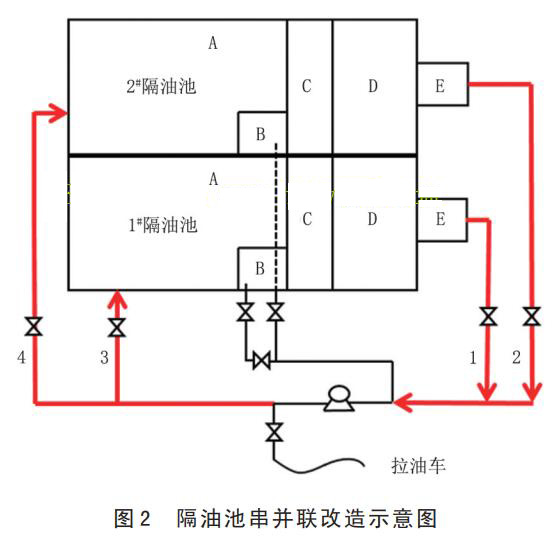 為延長(zhǎng)含油污水沉降時(shí)間,提高分離效果,對(duì)隔油池進(jìn)行流程改造。如圖 2 所示,A 為沉降池,B為 收 油 池 , C 為 集 水 池 , D 為 排 水 池 , E 為 緩 沖池。增加流程 1 至流程 4,含油污水在 1#隔油池沉降分離后,可通過(guò)流程 1、3 重新打入 1#隔油池,也可通過(guò)流程 1、4 打入 2#隔油池;含油污水在 2#隔油池沉降分離后,可通過(guò)流程 2、3 打入 1#隔油池,也可通過(guò)流程 2、4 重新打入 2#隔油池。隔油池流程可串聯(lián)或并聯(lián),實(shí)現(xiàn)了互聯(lián)互通。正常情況下,含油污水在 1#隔油池沉降分離后,通過(guò)流程 1、4 打入 2#隔油池,實(shí)現(xiàn) 2 個(gè)隔油池串聯(lián)使用。另外,在隔油池出口管線上連接耐腐蝕軟管,并將其固定在龍門架上,實(shí)現(xiàn)流程關(guān)斷,有效防止隔油池低液位卸車時(shí)油污直接沖進(jìn)蒸發(fā)池。在蒸發(fā)池增設(shè)攔油繩,將污油聚集在有限范圍內(nèi),用臨時(shí)泵連接軟管將油污打入隔油池。通過(guò)以上措施,充分保證隔油效果,進(jìn)蒸發(fā)池水質(zhì)清澈無(wú)油污。