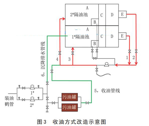 針對(duì)拉運(yùn)頻次高,成本費(fèi)用高,危廢產(chǎn)量大的問(wèn)題,將原環(huán)保試驗(yàn)污水罐改造為污油暫存罐,增設(shè)隔油池收油池至污油罐流程 (圖 3,流程 5),將收集的污油集中在污油罐內(nèi),達(dá)到一定液位后,用罐車?yán)\(yùn)至輪南環(huán)保站。該措施提高了污油儲(chǔ)存容積,大大降低了罐車?yán)\(yùn)頻次。同時(shí),增加污油暫存罐至隔油池流程 (圖 3,流程 6),罐內(nèi)污油重力沉降后,底部污水壓排至隔油池,降低了污油中混水比例,大大減少了轉(zhuǎn)運(yùn)危廢的數(shù)量。
