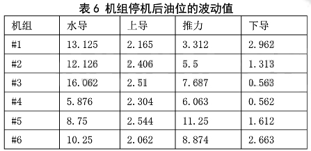 小結(jié):在機組停機后各部軸油箱油位有波動,主要原因是油箱內(nèi)部的靜態(tài)自平衡,還有傳感器的測量數(shù)值波動影響,故存在一定范圍的數(shù)據(jù)波動。6 臺機的各部軸承油位波動范圍沒有相同的規(guī)律。