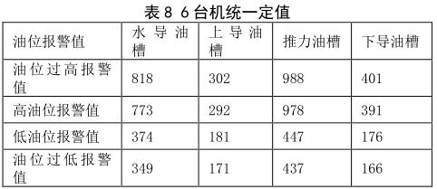 (2)依據(jù)成都勘測設(shè)計院給的定值要求,建議每臺機設(shè)置不同的報警值。設(shè)置原則:在上導(dǎo)、下導(dǎo)、推力各部油槽油位,結(jié)合機組運行時的油位*大值上設(shè)置高油位報警值+20mm、過高油位報警值 +30mm;*低油位值上低油位報警值 -20mm、低油位停機值 -30mm;水導(dǎo)油槽油位:高油位報警值 +45mm、過高油位報警值 +90mm;*低油位值上低油位報警值 -130mm、低油位停機值 -155mm;躲過報警值。在此基礎(chǔ)上,真實的油位只會下降,設(shè)置值對油位的運行是安全的。分析確定的#1-#6 機組各油槽油位的動態(tài)油位報警值,即機組運行時油槽油位的過低、低、高、過高報警定值如下,可以選擇表 9 的數(shù)據(jù) 6 臺機分別進行定值,同時也提供定值表 10 進行 6 臺機統(tǒng)一進行定值。