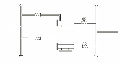 在輸氣站場根據(jù)下游用戶年設(shè)計輸氣量及檢維修需求通常設(shè)置兩臺臥式過濾分離器,運(yùn)行時通常采用一用一備方式運(yùn)行,氣量需求高峰時段達(dá)到單臺處理量時兩臺同時運(yùn)行以滿足用戶氣量需求。過濾分離器在整個輸氣站場工藝流程中通過法蘭與管道相連,同時上下游均設(shè)置球閥(見圖1),其中下游球閥與電動執(zhí)行機(jī)構(gòu)相匹配使用,能實現(xiàn)遠(yuǎn)程開關(guān)控制。在正常運(yùn)行狀態(tài)下,在用過濾分離支路的上下游球閥處于完全開啟狀態(tài),備用過濾分離支路的上游球閥處于開啟狀態(tài),下游球閥處于關(guān)閉狀態(tài)。對于過濾分離器切換有兩種方式:一種是手動模式,另一種是自動模式。在手動模式下可由操作人員通過遠(yuǎn)程和就地狀態(tài)下實現(xiàn)過濾支路流程切換;當(dāng)在自動模式下電動閥產(chǎn)生事故關(guān)斷時,則報警并自動選擇備用設(shè)備,打開備用支路的電動閥,關(guān)閉當(dāng)前支路的電動閥門,實現(xiàn)工作分離器和備用分離器的切換,上述過程由程序自動完成,不需人為干預(yù)。